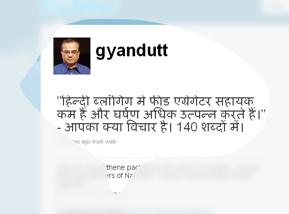 मेरा ट्विटर पर पूछना है – “हिन्दी ब्लॉगिंग में फीड एग्रेगेटर सहायक कम हैं और घर्षण अधिक उत्पन्न करते हैं।” – आपका क्या विचार है। 140 शब्दों में।