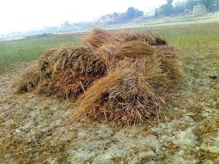 कल्लू के सरसों के खेत की कटाई के बाद गट्ठर खेत में पड़ा था।