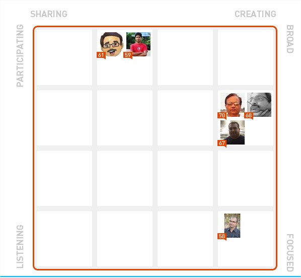 अभी मैने पाया कि संजीत त्रिपाठी, गिरिजेश राव, प्राइमरी के मास्टर प्रवीण त्रिवेदी और विवेक रस्तोगी क्रमश 58, 66, 60 और 65 के स्कोर के साथ क्लॉउट पर सशक्त उपलब्धि रखते हैं। इन लोगों की फेसबुक पर उपस्थिति जब से क्लॉउट पर दर्ज हुई है, इनका क्लॉउट स्कोर 15-20 से दन्न से बढ़ कर 60 को छूने लगा।
