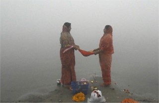 दो स्त्रियां यह गीत गाते हुये एक अंगोछे में कुछ (बाल कृष्ण का प्रतीक) झुला रही थीं गंगा किनारे। कोहरा बहुत था। इक्का दुक्का लोग थे स्नान करने वाले गंगा जी के शिवकुटी घाट पर। उनका यह झुलाना और गायन बहुत अच्छा लगा मुझे। पर यह समझ नहीं आया कि ऐसा कर क्यों रही थीं वे।