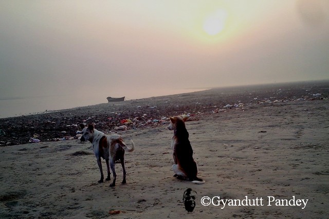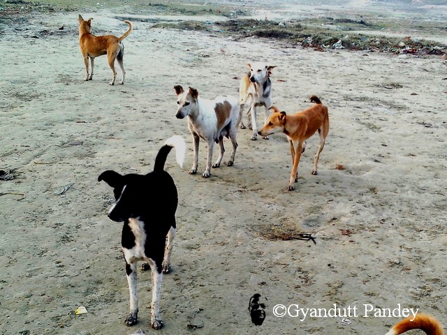 कई कुत्ते दीखते हैं गंगा के कछार में। रोज सवेरे इधर उधर चक्कर लगाते हैं। लोग जो स्नान करते समय पूजा सामग्री चढ़ाते हैं, उसमें से खाद्यपदार्थ उनके काम आता है। गंगा में कोई मरा हुआ जीव बहता दीखता है तो उसे ये पानी में हिल कर खींच लाते हैं। अगर वह सड़ा हुआ नहीं होता तो वह उनका भोजन बनता है। इस ओर दूर दूर तक – रसूलाबाद से दारागंज तक श्मशान घाट नहीं है। इस लिये उन्हें मानव शव में मुंह मारने का अवसर नहीं मिलता।