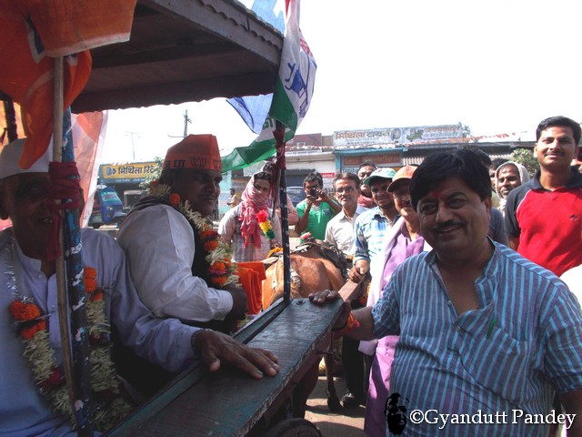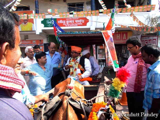 श्री रवीन्द्र पाण्डेय के चुनाव कार्यालय/घर के बाहर विद्यासागर चौहान की टमटम।