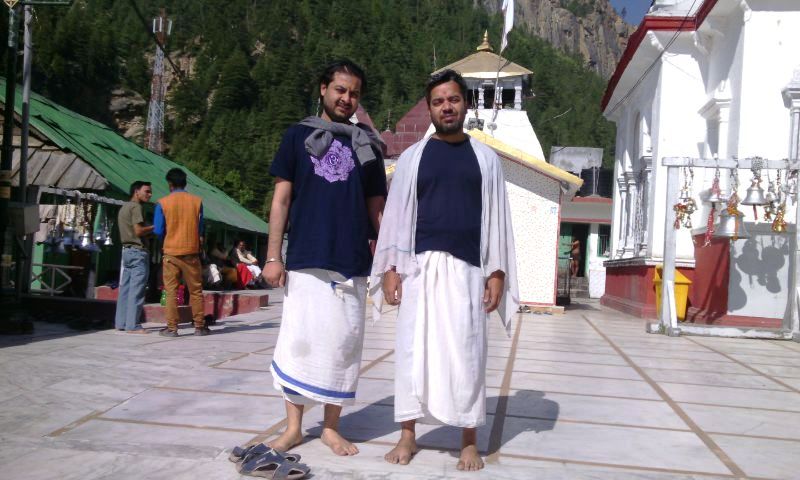 अगले दिन शैलेश ने अपना और हर्ष का धोतियां लपेटे उस स्थान का चित्र भेजा, जहां राजा भगीरथ ने (गंगावतरण के लिये) तपस्या की थी। महान तपस्वी। काश गंगा-शुद्धिकरण वाले गालबजाऊ लोग उनमें अपना आदर्श तलाशते। वे लोग इस प्रकार यायावरी कर वहां जायें तो शायद गंगाजी को पुनर्जीवित करने की भावना से ओतप्रोत हो सकें।