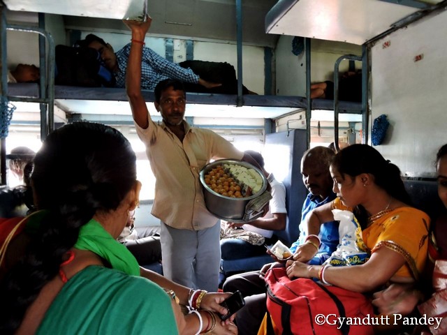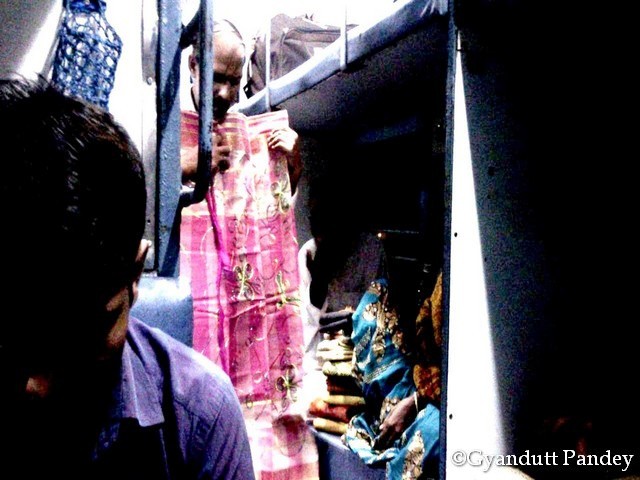 यह प्लेटफार्म पर ट्रेन आ गयी है जो मुझे गन्तव्य की ओर ले जायेगी। वह गन्तव्य, जिसके बारे में मुझे अन्दाज भर है। ट्रेन समय से खुलती है – 17:35 पर। और ट्रेन में तरह तरह का सामान बेचने वाले आ घुसे हैं। पजामे का नाड़ा, सेफ्टी-पिन, साड़ी, टॉर्च और जाने क्या क्या! पास वालों ने 100 रुपये में साड़ी खरीदी है।