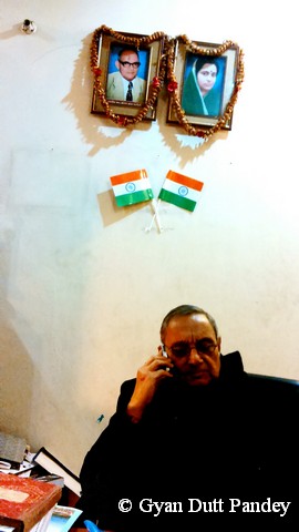 श्री लाहिरी का दफ्तर (या अध्ययन कक्ष) मंझोले आकार का और सुरुचिपूर्ण था। मेज, कुर्सी, फाइलें, कागज, दीवार पर पुरात्त्व विषयक सामग्री के चित्र और अलमारियों में सरयूपार क्षेत्र के इकठ्ठे किये हुये कुछ टेरा-कोटा के नमूने थे। शाम के साढ़े छ बजे थे। कमरे में उनके चित्र लेने के लिये मेरे पास मोबाइल भर था, जो ट्यूबलाइट की रोशनी में बहुत अच्छे परिणाम नहीं देता। मुझे उनसे मिलने के बाद अहसास हुआ कि समय का ध्यान कर कैमरा भी उपयुक्त होना चाहिये।