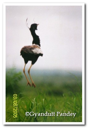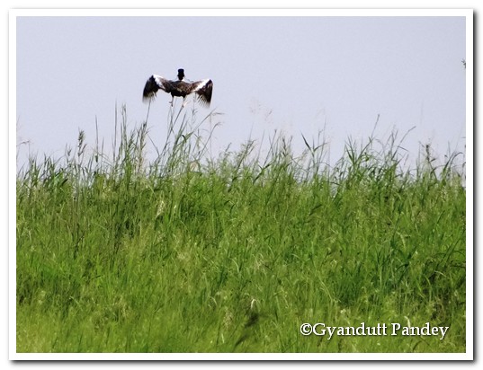 इस वीडियो में खरमोर नर पक्षी झाड़ियों में कहीं बैठी मादा को आकर्षित करने के लिये ऊंची-ऊंची छलांगें लगा रहा है।