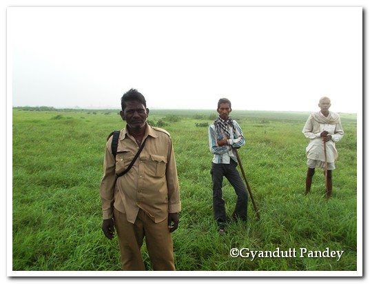 हमें फॉरेस्ट गार्ड भीमा और उनके साथ अन्य चार-पांच कर्मियों ने बाइनाक्यूलर्स दिये देखने को। यह भी बताया कि ‘उस’ ओर जो झोंपड़िया सी दिख रही हैं, उसके पास है खरमोर। उसे पहचान कर स्थिति साधने में कुछ समय लगा। उसके बाद कई बार खरमोर को उछलते देखा। खरमोर बगुले से बड़े और मोर से छोटे आकार का पक्षी है। उसकी चाल में ग्रेस है और उसकी लगभग ऊर्ध्वाकार छलांग तो गजब ही है। ऐसा किसी अन्य पक्षी को करते नहीं देखा।