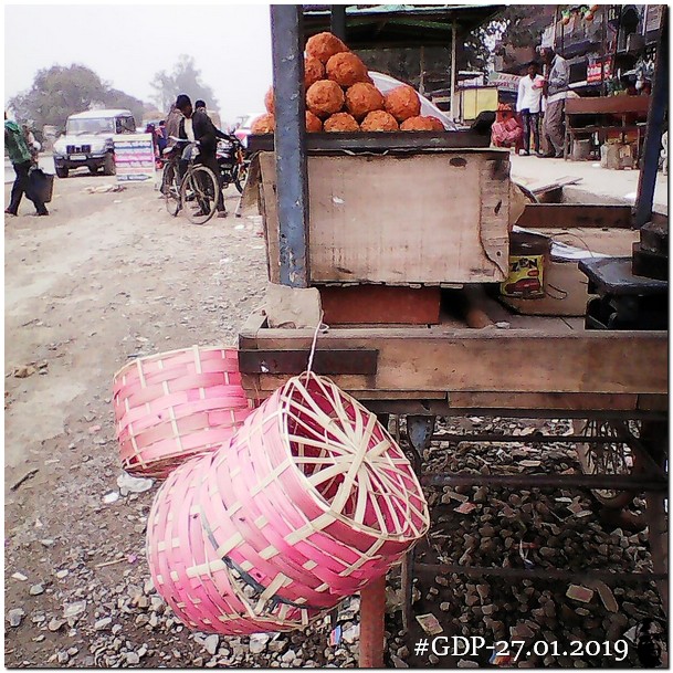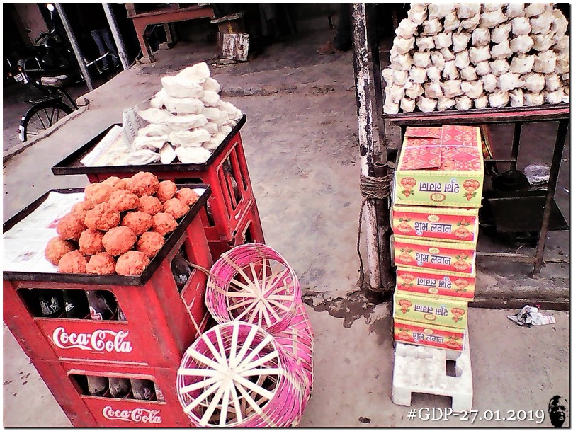 एक मिठाई की दुकान वाला और उसके सामने एक ठेले वाला बने बनाये लड्डू (लेडुआ), खाझा, झांपी आदि रखे था। लड्डुओं का रंग बता रहा था कि उनमें भरपूर चीनी और रंग का प्रयोग किया गया था। खाझा को बर्र (Wasp) से बचाने के लिये एक जगह उन्हें प्लास्टिक की पारदर्शक पन्नी से ढंका गया था। आमतौर पर यूं ही खुला रखा गया था।