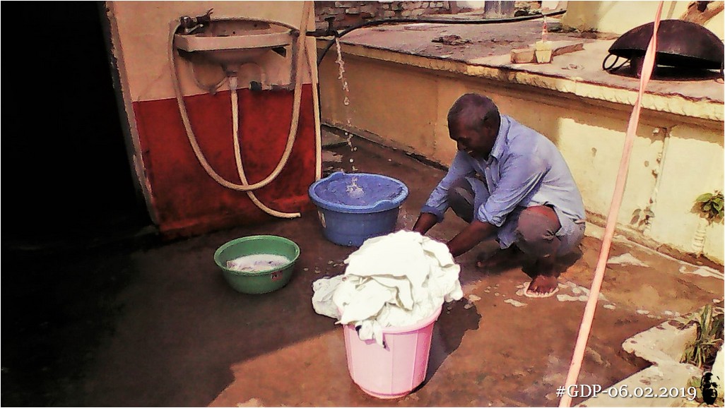 किसी पुरानी चोट के कारण घुटने में दर्द रहता है। मेरी पत्नीजी ने दर्द के कारण उसे मेरा पुराना नी-गार्ड (knee guard) दिया। कुछ दिन लगाया उसने। पर धोबी के काम में ठण्डे पानी में लम्बे समय तक काम तो करना ही पड़ता है। दर्द के बावजूद उसे काम में लगे देखता हूं मैं।