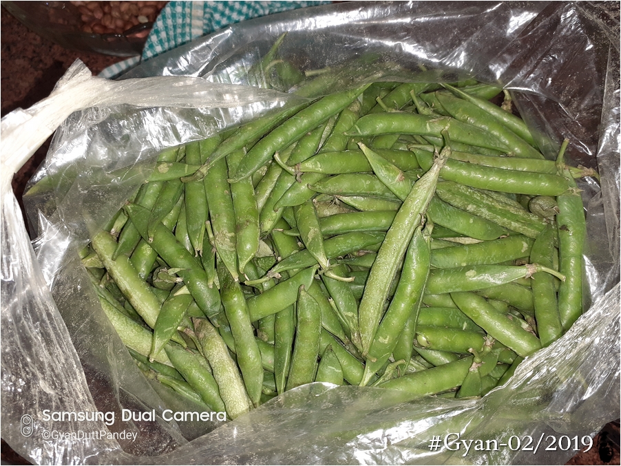 दो बिस्सा जमीन में मटर बोई थी। चार दिन पहले वह लाया था बेचने। 14रुपये किलो दी थी। बहुत अच्छी और मीठी मटर। लम्बी छीमी और हर छीमी में 6-9 दाने। स्वाद लाजवाब था – इस मौसम की सबसे बेहतरीन मटर थी वह। दो बिस्वा (1 बिस्वा बराबर 125 वर्ग मीटर) खेत में बहुत ज्यादा तो होती नहीं। आज दूसरी बार तोड़ी तो आसपड़ोस वाले ही ले गये। किसी तरह से 3 किलो बचा कर लाया हमारे लिये।