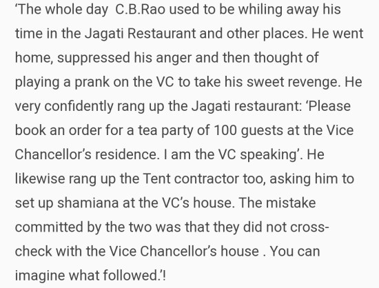 सी.बी. राव दिन भर पागलों की तरह घूमते रहे। फिर उन्होने अपना बदला निकाला। उन्होने जगाती रेस्तराँ को फोन कर कहा कि मैं वाईस चांसलर बोल रहा हूं और शाम को मेरे घर 100 लोगों की चाय पार्टी का इन्तजाम करना है। ऐसा ही फोन टेण्ट हाउस वाले के यहां भी शामियाना लगाने के लिए किया। जगाती और टेण्ट हाउस वालों ने ऑर्डर कन्फर्म करने की जरूरत नहीं समझी। और जो हुआ, उसकी रोचकता की कल्पना की जा सकती है।