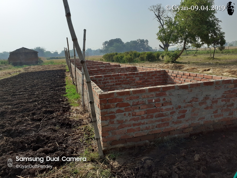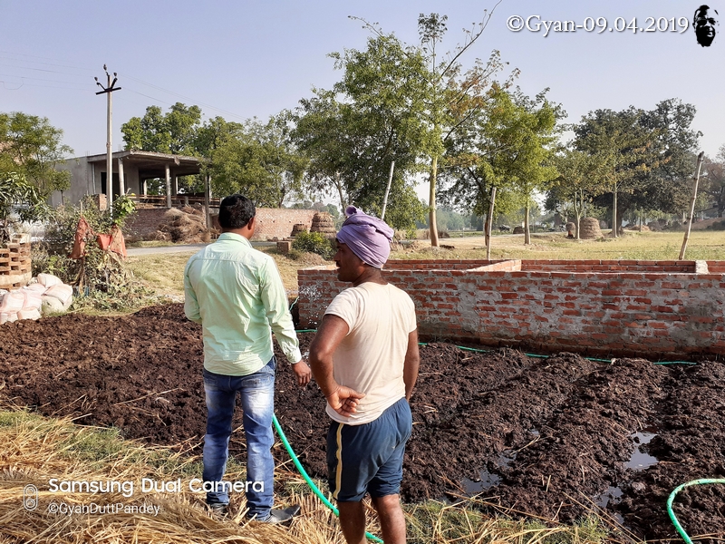 रघुबीर ने मुझे पूरी प्रक्रिया बतायी जैविक खाद की। अभी गोबर के बेड को वे नम कर ठण्डा कर रहे हैं। नमी में लगभग 7-10 दिन गोबर पड़ा रहेगा। उसके बाद उसे ईंटों की बनी 16 पिट्स में केचुये के बीज मिला कर छोड़ देंगे। लगभग पचास दिन में केचुओं की गतिविधि से जैविक खाद तैयार होगी।
