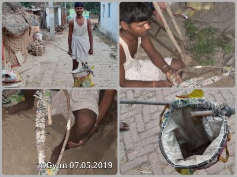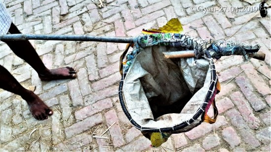 राजेन्द्र का पूरी तरह बना खोंचा। चित्र में लग्गी का हुक और बेल सहेजने के लिये थैला स्पष्ट है।