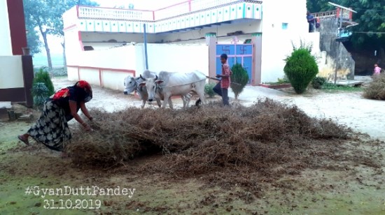 सामने उडद की फ़सल का ढेर लगा है। एक जोड़ी बैल ले कर अधियरा और उसकी पत्नी उडद की दंवाई कर रहे हैं। गोल गोल घूमते बैल अच्छे लगते हैं। यह दृष्य सामान्यत: आजकल दिखता नहीं गांव में। बैल खेती के परिदृष्य से अलग किए जा चुके हैं।