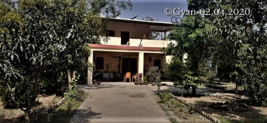 घर की इस यात्रा में और भी छोटे मोटे पड़ाव हैं। पीछे चारदीवारी में खेत की ओर जाने का एक छोटा गेट है, जिससे गेंहू का खेत दिखता है। उसके आगे सागौन के पेड़ हैं। घर के ऊपर – दूसरी मंजिल के ऊपर सोलर पैनल है। वहां खड़े हो कर गांव का हराभरा दृष्य बहुत सुंदर लगता है।