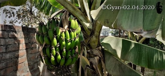 नीम के किशोर वृक्ष हर तरफ हैं। उनके सारे पत्ते झर चुके हैं और नये आ रहे हैं। कुछ ही दिनों में ये हरे भरे हो जायेंगे। केले का एक गाछ है। पिछली बार उनके पेड़ पर प्राकृतिक तरीके से पके केलों का स्वाद ही निराला था। और फल कई दिन रखने पर सड़े-गले नहीं थे।