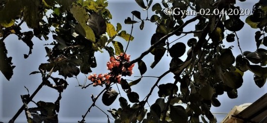 इसी नल के पास एक पारिजात – हारसिंगार – का वृक्ष है। उसकी बगल में चार साल की उम्र का पलाश। पलाश के फूल इस साल देर से आये हैं। हमारे इस पलाश में तो पहली बार ही आये हैं। अभी नया नया पेड़ बना है ये पलाश।