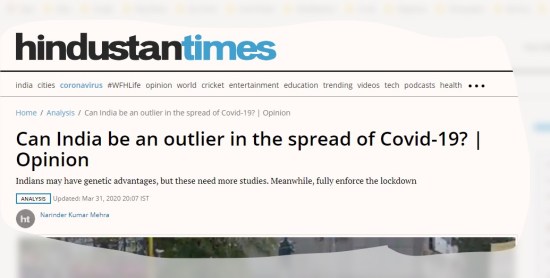 पर भारत में कुछ न कुछ अलग सा जरूर है। हिंदुस्तान टाइम्स में नरिंदर कुमार मेहरा जी का लेख है – कैन इण्डिया बी एन ऑउटलायर इन स्प्रेड ऑफ कोविड19? वे एक इम्युनोलॉजिस्ट हैं। मेहरा जी अखिल भारतीय आयुर्विज्ञान सन्स्थान (एम्स) के डीन रह चुके हैं।