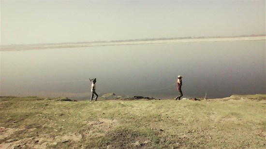 करीब दस मिनट रहा मैं गंगा तट पर। नदी में आगे दूर दो आदमी नहाते नजर आये। सामान्यत: 8-10 लोग होते थे। आजकल नित्य स्नान करने वाले भी नहीं हैं। कोई ज्यादा एक्टिविटी नहीं थी। एक नाव जरूर गुजरी किनारे किनारे गंगा की धारा के विपरीत – पश्चिम दिशा में जाती। उसे गंगा किनारे पैदल चलते दो व्यक्ति रस्सी से खींच रहे थे। मेरे पास बेहतर कैमरा नहीं था उनकी गतिविधि रिकार्ड करने के लिये। मछेरों की नाव थी। नाव पर जाल लादे दो लोग सवार थे।