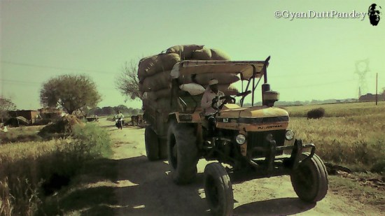 साइकिल रोकने का एक निमित्त मिला – यह भूसा ढोने वाला ट्रेक्टर। सवेरे सवेरे काम पर लग गया था। लगता है एक घण्टा पहले निकलना चाहिये साइकिल ले कर। अन्यथा लोग काम धंधे पर लग जाते हैं और सड़क उतनी वीरान नहीं रहती, जितनी अपेक्षा करता था मैं।