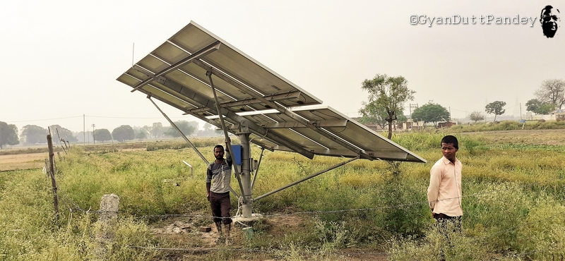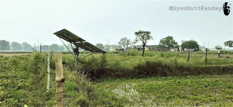 सोलर पैनल के सामने से चित्र लेना चाहता था। पर खेत में भरे पानी और कंटीली तार की बाड़ के कारण वह सम्भव नहीं हो सका। वह फिर कभी।