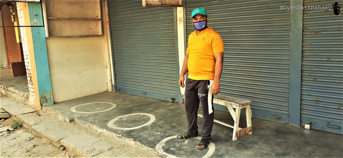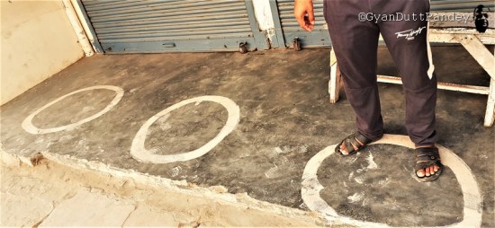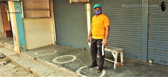 “अब बस यही गोले हैं, और गोलों में खड़े ग्राहक। जिंदगी गोलों में बंध गयी है। पता नहीं कितने दिन चलेगा। शायद लम्बा ही चलेगा!” – माणिक कहते हैं। यह भी बताते हैं कि ग्राहकी पहले से कम हो गयी है। शायद अभी लोग बाजार करने निकल ही नहीं रहे। अभी शायद नये सामान की खेप भी नहीं आ रही।