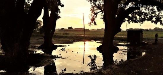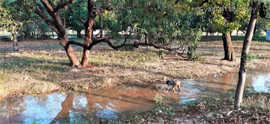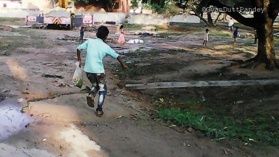 एक और बच्चा आम के पेड़ के नीचे भर आये पानी में से आम बीनने का प्रयास कर रहा था। उस उपक्रम में पानी में उसकी चप्पल निकल गयी थी। अब वह आम भी तलाश रहा था और चप्पल भी।