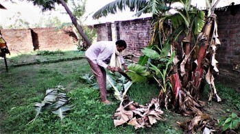 बगल के गांव मेदिनीपुर में एक व्यक्ति ने सर कह कर नमस्कार किया। शायद वह स्टेशन पर काम करता है। कोई रेलवे कर्मचारी। स्टेशन से लौटा था तो आम बीनता आया। उसने अपनी पोटली दिखाई, करीब तीन किलो आम होंगे। वह दुखी भी था, उसके गाय गोरू बांधने के कमरे (गोरूआर) का छप्पर आंधी में उड़ गया था।