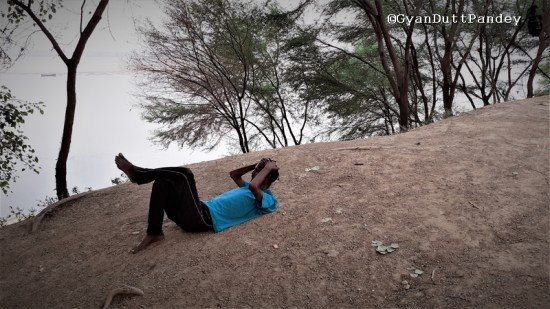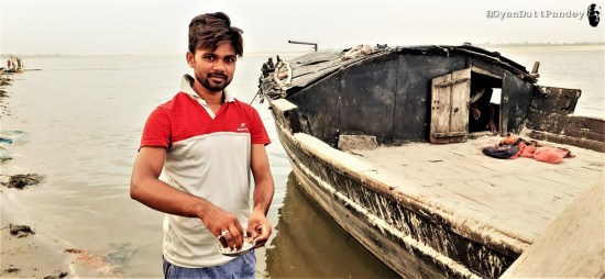 पर कई लोग पूरी तरह बेफिक्र नजर आते हैं! सवेरे गंगा किनारे नावों के पास बैठे नौजवान उसी प्रकार के हैं। आपस में चुहुलबाजी करते। उनमें से एक नौजवान बार बार मुझे उसका चित्र लेने के लिये कहता है। वह आटा सान रहा है एक दोने में। बताया कि मछली पकड़ने के लिये चारा बना रहा है। फोटो खिंचाने के लिये पोज बना कर खड़ा हो जाता है। अगले दिन वह फिर मिलता है। मैं पूछता हूं – मछली मिली?