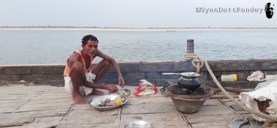 कण्डे का स्टोव और भोजन बनाने का स्थान बदलते रहते हैं नाव पर। पर व्यक्ति वही होते हैं। आज फोटो लेते लेते मैंने उस भोजन बनाते व्यक्ति से बातचीत की।