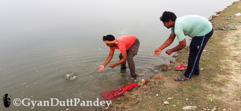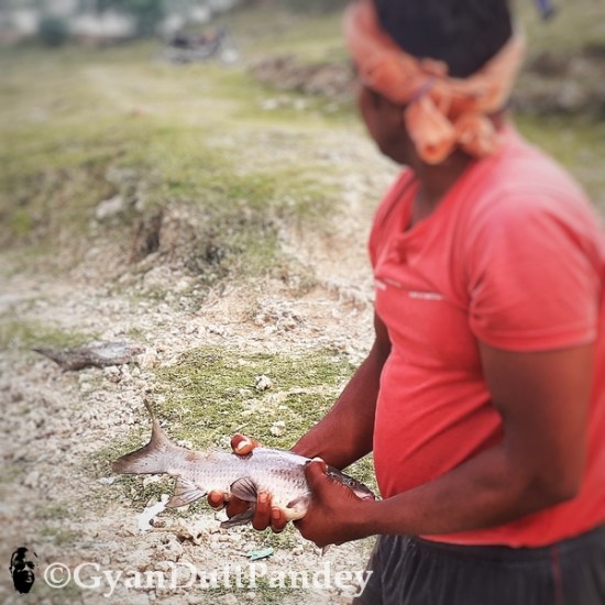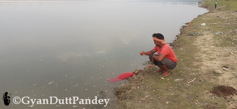 “मछलियां इसी समय ज्यादा मिलती हैं। जैसे जैसे नहाने वाले बढ़ते हैं और गोरू चराने वाले पानी पिलाने आते हैं अपने गाय-भैसों-भेड़ों-बकरियों को, मछलियां गहरे पानी में चली जाती हैं।”