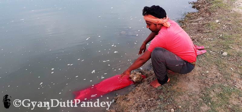 उस लाल झोले में मछली सहेज कर रखी गोविंद ने और कंटिया पर नया आटे का चारा फंसाने लगे। मैंने भी उन्हे नमस्कार कर विदा ली। अपने बटोही को फिर वापस धकेलना-खींचना प्रारम्भ किया। आज गोविंद पटेल से मुलाकात ने बहुत जानकारी दी मुझे। लॉकडाउन और आम आदमी को समझने का एक नया दृष्टिकोण भी दिया।