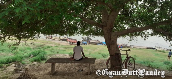 वह पत्थर की बेंच पर पेड़ के नीचे बैठा था। बगल में एक पुरानी साइकिल। पेड़ के तने से उंठगा कर खड़ी कर रखी थी। गंगा किनारे नावों और उनके आसपास की गतिविधि निहार रहा था। अकेला था। पूरा दृश्य कुछ ऐसा था सवेरे साढ़े पांच बजे कि लगा कोई अपने विचारों में खोया या सवेरे की शांत छटा निहारता दार्शनिक टाइप जीव हो। मुझे लगा कि ऐसा बहुत सम्भव है। गंगा विचारों में विचरण करने वालों को आकर्षित अवश्य करती हैं।