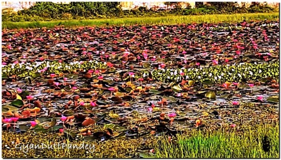 मैं सवेरे साइकिल भ्रमण में घर के पास नेशनल हाईवे के किनारे उस दो बीघा जमीन में फैले ताल को देखता हूं। सैंकड़ोंं कमल खिले हैं उसमें। बीच बीच में जलकुम्भी भी है। बहुत मनमोहक हैं वे। पर समय के साथ पटरी नहीं बिठा पायेंगे वे। दो महीने बाद जब जल सूख जायेगा, तब वे भी सूख जायेंगे। वही दशा होगी जो बिहारी जी सतसई में कहे हैं।