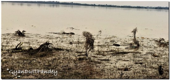 बदली परिस्थिति से सामंजस्य न बिठा सकने की दशा प्रकृति में कई स्थानों में दिखती है। आज देखा कि लूटाबीर तट पर गंगा जी का जल कम हो रहा है, पर वह वनस्पति, जो हफ्ता भर पहले तट पर हरी भरी थी, अब हफ्ते भर में ही कंकाल बन गयी है। प्रकृति, जिसमें अनुकूलन (adaptibility) कहीं ज्यादा है, वह भी नहीं संभल पाती तो आदमी, जिसके चरित्र में कितनी कृत्रिमता है, वह कहां से सामंजस्य बनायेगा। उसे तो, बकौल सूर्यमणि जी, एक एक रुपया एक खाते से दूसरे में कर ही आदमी साध पायेगा।