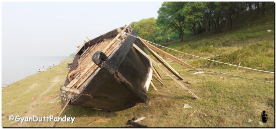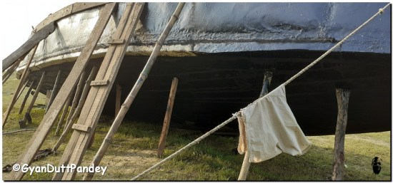 नाव पूरी तरह नहीं औंधाई गयी थी। बल्लियों और पटरों की मदद से उसे उल्टा उंठगाया भर गया था। इस दशा में रखा गया था कि उसपर आसानी से पेण्ट किया जा सके। गंगा किनारे और कोई व्यक्ति उसपर काम करने वाला नहीं था। मैंने नाव के कई कोणों से चित्र लिये। उसी नाव के पास एक और नाव थी, उसका भी वार्षिक संरक्षण कार्य हो रहा था। उसमें भी काला पेण्ट हो रहा था।