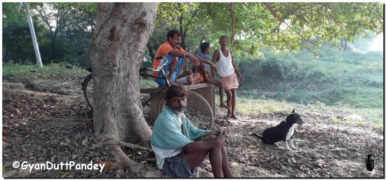 चित्र खींच कर लौटने लगा तो वहीं गंगा किनारे एक पेड़ के नीचे कुछ गांव वाले दिखे। उनके साथ एक कुत्ता भी था। बड़ा जीवंत दृष्य। एक सज्जन ने मुझे अभिवादन भी किया – पालागी पण्डितजी! निश्चय ही वे मुझे जानते होंगे। वे लोगों के इकठ्ठा होने का इंतजार कर रहे थे। करीब बीस बाइस लोग देखते देखते जमा हो गये और वे उस औंधी नाव की ओर बढ़े।