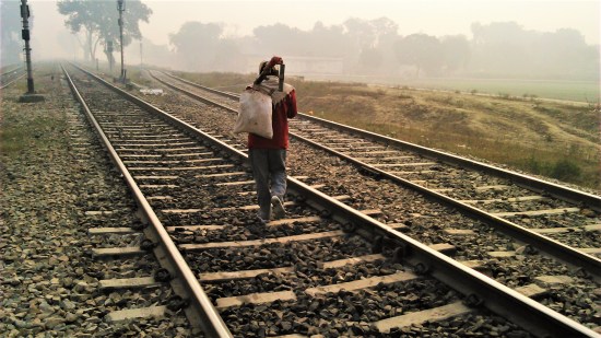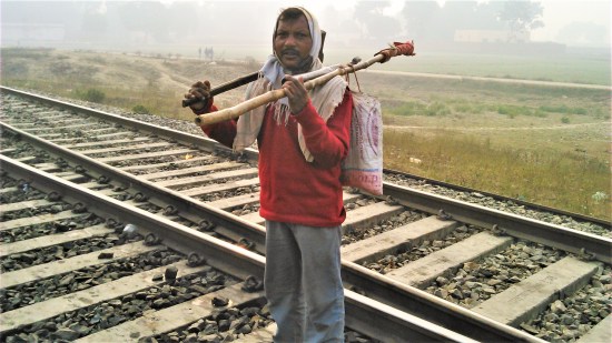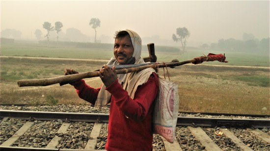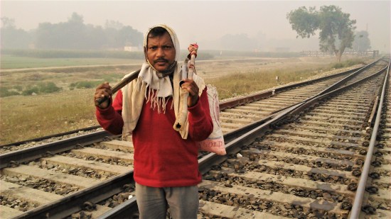 बसंत को मैंने कटका रेलवे स्टेशन के पास अपनी पोस्ट-रिटायरमेण्ट रिहायश बनाने के बाद सन 2016 के प्रारम्भ में पहली बार देखा था। सवेरे सवेरे वह कोहरे के मौसम में मफलर पहने चला जा रहा था अपने काम पर। इधर उधर ताकता-झांकता और ढीली पैण्डरोल क्लिप्स को अपने हथौड़े से कसता वह बढ़ रहा था। बहुत ही फोटोजीनिक दृष्य था वह। मैंने साइकिल खड़ी कर उसके कई चित्र, कई कोणों से लिये थे। उसका चित्र इतना पसंद आया था कि कई साल तक बसंत मेरे फेसबुक के कवर पर बना रहा। उसके मफलर पहने चित्र को देख कर बहुत सी टिप्पणियों में उसे अरविंद केजरीवाल कहा गया। यद्यपि बाद में लिये उसके चित्रों में वह मुझे नाना पाटेकर जैसा लगा! :lol: