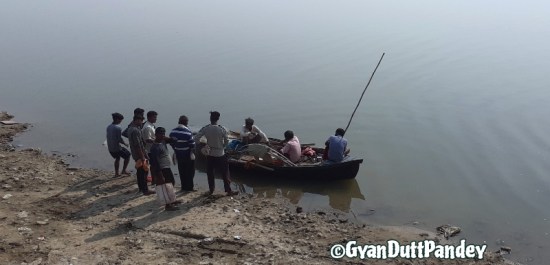 दो समूह थे। एक नाव पर। उसमें तीन लोग थे। गंगा उस पार के सिनहर गांव के केवट। नदी किनारे जमीन पर खड़े लोग थे (शायद) द्वारिकापुर गांव के बाबू साहब लोग। वे मछली बेचने वाले नहीं थे। बेचने वाले सवेरे सवेरे आते हैं इन केवटों से मछली खरीदने। इस समय दोपहर के साढ़े बारह बजे थे। ठाकुर साहबों को शायद दोपहर में मछली खाने का मूड हो आया था।