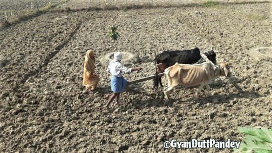 अधिया पर खेत जोतता किसान दम्पति
