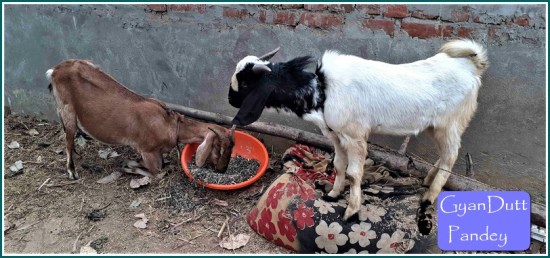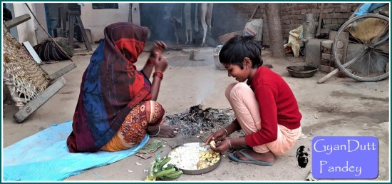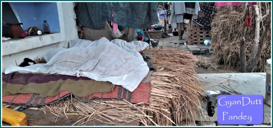 उसके पास एक दो बकरियां हैं – वे उसका गाढ़े समय के लिये बीमा जैसी हैं। अगर फसल नहीं हुई तो बकरी बेच कर काम चलता है। कुछ मुर्गियां होती हैं। बिस्तर के लिये गद्दे नहीं हैं, सर्दी की गलन से बचने को वह पुआल बिछाता है। औरतें दिन में दो तीन घण्टे सूखी घास और पत्तियां बीनती हैं , जिससे अलाव जलता है और खाना बनता है। आधे पर खेत जोतने के लिये हल बैल या ट्रेक्टर वह किराये पर लेता है। उसके अपने घर में एक फावड़ा भी शायद न हो। खुरपी मिले, बस। फटक गिरधारी है वह। न लोटा न थारी!