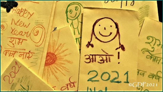 पद्मजा (चीनी, चिन्ना) बहुत दिनोंं से कह रही थी नये साल को मनाने के लिये। स्कूल बंद होने से बच्चे को कोई नया करने को चाहिये। तब मैंने चीनी के साथ सोचा कि ग्रीटिंग कार्ड बनाये जायें। जब मेरे बच्चे छोटे थे तब यह सब मैं खाली समय में उनके साथ करती थी। ढाई तीन दशक बाद अब फिर मन हुआ वही सब करने के लिये अपनी पोती के साथ।