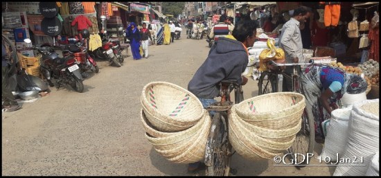 आज संक्रांति के अवसर पर हम लाई, चिवड़ा, गुड़ की पट्टी, तिलकुट, रेवड़ी, गुड़ का लेड़ुआ और गजक जैसी चीजें खरीदने के लिये महराजगंज बाजार गये थे। वहां गिर्दबड़गांव की धईकार बस्ती के संतोष दिखे। एक साइकिल पर बांस की दऊरी लटकाये थे। दुकान वाले को उन्होने वे दऊरियां बेंच दीं।