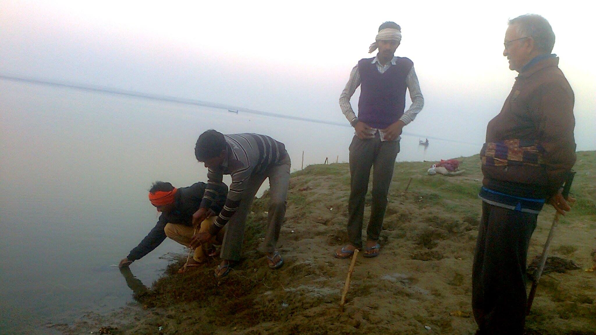 रास्ता ट्रेक्टर के गंगा तट पर बालू की (अवैध) ढुलाई लिये बना था। नयी सरकार के आने के बाद यह सुनिश्चित करने के लिये कि बालू की ढुलाई न हो सके, रास्ते को काट दिया गया था उस पर आड़ी खाई बना कर। उस खाई के साइड से अपनी मोटर साइकिल लाते हुये वे तीन नौजवान गंगा तट की ओर बढ़े। जितनी तेजी दिखा रहे थे, उससे हमें (राजन भाई और मुझे) यह लगा कि वे कहीं कोई अवैध काम न करने जा रहे हों गंगा तट पर।