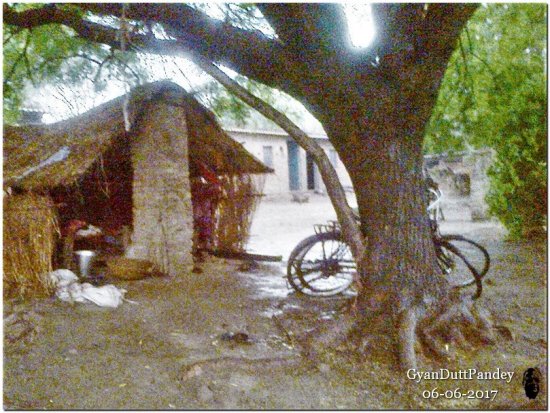 हम (राजन भाई और मै) ने टीले के खड़ंजे के किनारे साइकिलें खड़ी कर दीं। पेड़ के नीचे खड़े हो गये। तब भी आशा थी कि बारिश रुक जायेगी। वह बढ़ती ही गयी। मुझे अपने से ज्यादा अपने कैमरे और मोबाइल की फिक्र होने लगी। अगर उनमें पानी चला गया और वे खराब हो गये तो 20-25 हजार का चूना लग जायेगा। एक क्षण मैने निर्णय लिया – यह नहीं देखा कि राजन भाई कहां खड़े हैं; बटोही को बबूल के तने के साथ अधलेटा किया; अपना कैमरे/मोबाइल का थैला लिया और टीले पर तेजी से चढ़ गया। सामने एक मड़ई थी। एक औरत उसमें अपना सामान रख रही थी। उसे कहा कि कुछ देर मड़ई में रुकूंगा मैं। चिरौरी वाले अंदाज में कहता तो सम्भावना (भले ही बहुत कम) थी कि वह मना कर देती। अत: लगभग निश्चयात्मक अंदाज में मैने कहा।