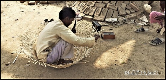 मैंने पास के गांव – वह बड़ा गांव है, कस्बे जैसा – गिर्दबड़गांव की धईकार बस्ती के बारे में पहले भी लिखा है। अब, जब तय किया कि पत्नीजी के साथ भ्रमण किया जायेगा, तो गंगा तट के बाद दूसरा स्थान मैंने उस बस्ती को चुना। उस बस्ती के लोग बांस की ग्रामीण अंचल में प्रयोग होने वाली वस्तुयें बनाते हैं – उसौनी, चंगेरी, छिंटवा, झऊआ, बेना आदि।