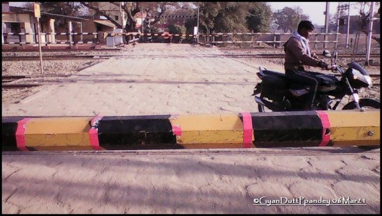 लेवल क्रासिंग के दूसरी ओर एक ट्रेक्टर और एक साइकिल वाला खड़े थे। साइकिल वाला पीछे करीयर पर और आगे हैण्डिल में सामान के थैले लादे था। इस लिये वह झुका कर पार कर पाने में असमर्थ था।