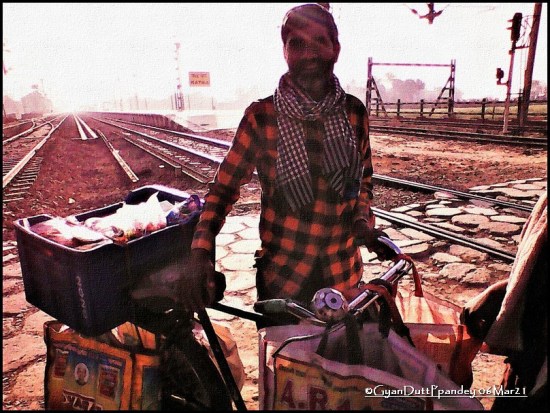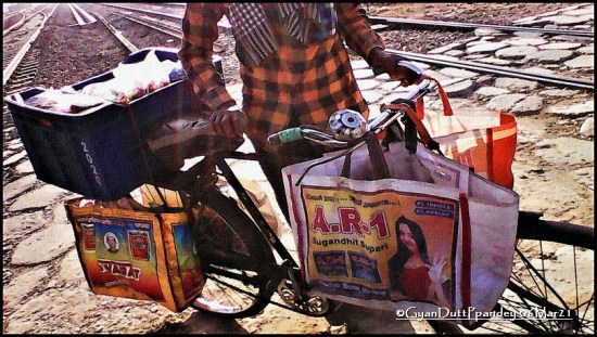 ट्रेन गुजर गयी तो वह साइकिल वाला और मैं गेट खुलने पर बीच ट्रैक में मिले। उसको मैंने रोका और पूछा कि क्या ले कर जा रहा है?