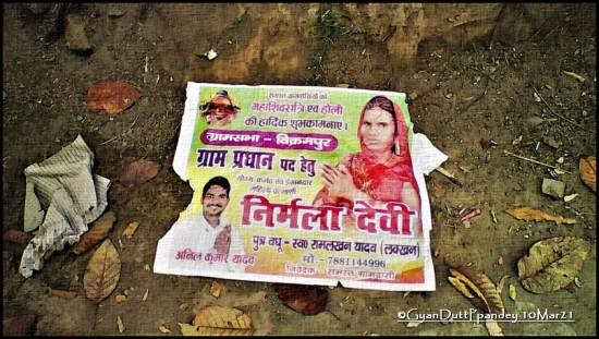 एक जमीन पर फैंका पोस्टर किसी निर्मला देवी का था। उनके श्वसुर स्वर्गीय लक्खन यादव और पति या पुत्र अनिल कुमार यादव का नाम था। यह पोस्टर कई और दीवारों पर लगा भी दिखा। लगता है कि रात में किसी ने लगाये होंगे और सवेरे सवेरे किसी अपोजिट पार्टी वाले ने नोच दिया होगा। बहरहाल पोस्टर लगने की शुरुआत हो गयी है। अब दर्जन भर उम्मीदवार गांव की सभी लावारिस और विज्ञापन के लिये उपयुक्त दीवारें एक दो दिन में पोस्टरों से पाट देंगे।