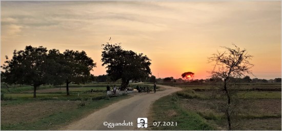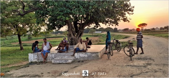 दोनो गांवों की संधि पर यह सड़क किनारे चबूतरा मुझे बरबस हजारों साल पहले के अतीत में ले जा रहा था। यह सड़क भी गंगा नदी के समांतर चलती प्राचीन काल का उत्तरापथ रही होगी। मगध-काशी को पेशावर से जोड़ती। तब भी यहां खेत रहे होंगे। ट्रेक्टर की बजाय हल बैल से खेती होती रही होगी और अरहर की बुआई कर सांझ मे किसान यहीं उत्तरापथ के किनारे सुस्ताते, बोलते बतियाते रहे होंगे। गंगा यूं ही पास में बहती रही होंगी। सूर्यास्त भी ऐसे ही होता रहा होगा। मेरे जैसा आदमी भी सांझ की सैर को निकलता रहा होगा! …
